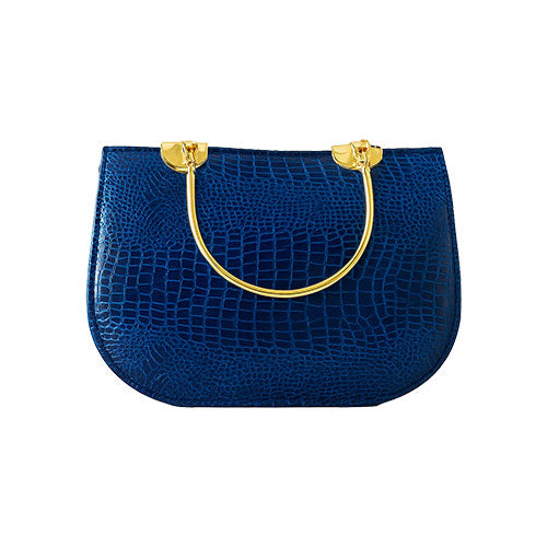 This handbag features a luxurious chestnut brown crocodile-embossed finish, complemented by polished gold-tone hardware and Coach's iconic horse-and-carriage logo. The structured silhouette and curved base evoke a classic saddle bag design, perfect for timeless elegance in both formal and smart-casual outfits.